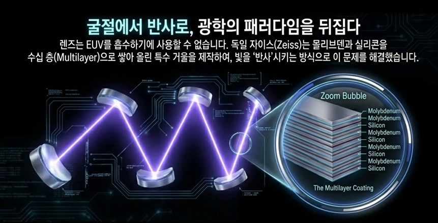 EUV 빛은 그 특성상 공기와 일반 유리를 통과하지 못하고 대부분 흡수되어 버려요. 그래서 우리가 흔히 사용하는 유리 렌즈 대신, 빛을 반사시키는 '거울(Mirror)' 시스템을 사용해야만 합니다. 게다가 이 모든 광학계는 완벽한 진공 상태에서 작동해야 해요. 여기서 독일 광학 기업 자이스(Zeiss)의 기술력이 빛을 발합니다.